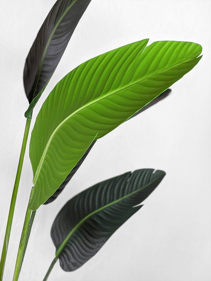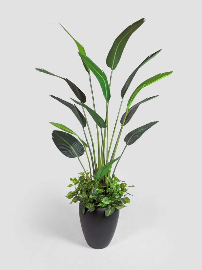 Giant Bird of Paradise in black fiber pot covered with pothos plant